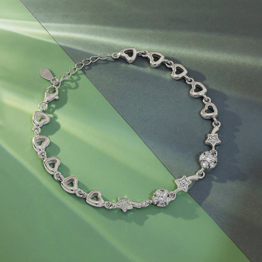 925 Sterling Silver Cubic Zirconia Floral-Shaped Heart Bracelet for Women has a luxury design made of 925 sterling silver. The silver bracelet features shiny, solid heart-shaped links, two flower-shaped frames, and three star-shaped silver frames adorned with cubic zirconia stones, forming a sequence chain delicately polished with a high-grade rhodium...