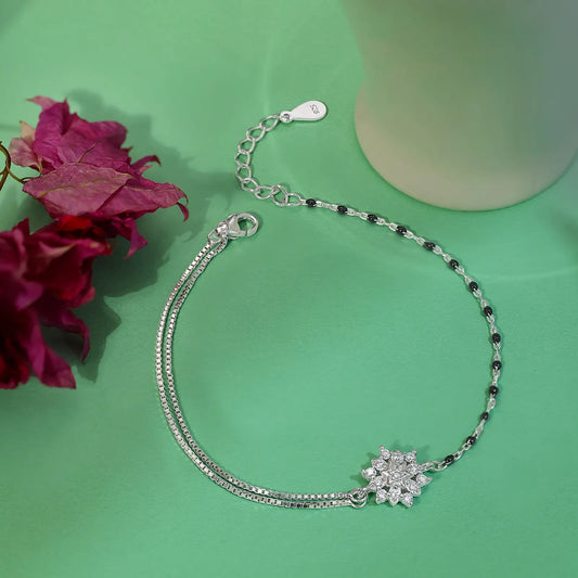 Exquisite Silver Floral Chain Bracelet has a superb design with rhodium Finish. It features a floral-shaped 925 sterling silver frame adorned with round, white cubic zirconia stones set on a double-layer chain, with one side a box chain while the other side has a black beaded chain. Tweov created this...