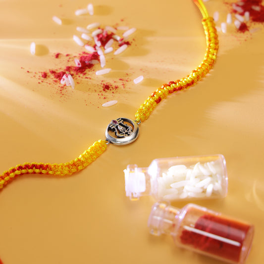 The Trendy Shiva Trishul Rakhi for Brother has a heavenly design with a rhodium finish. It features a marquise-cut cubic zirconia red stone embedded in a shiny circular frame with Lord Shiva's Trishul made of 925 sterling silver, set on a braided red and yellow thread. It comes with a...