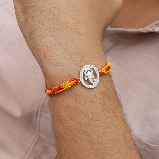 CZ Oval Silver Rakhi for Brother features an oval-shaped silver frame studded with a white cubic zirconia. This silver rakhi is crafted from 925 sterling silver with a premium rhodium finish and connected with red and yellow thread. Rakhi is a perfect occasion for sharing a loving bond and praying...