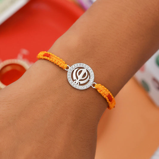 Khanda Silver Rakhi for Brother has a delicate design plated with rhodium. It features an Omkar (khanda) holy symbol of Sikhism made of 925 sterling silver, connected with braided red and yellow thread. It comes with a pack of roli and chawal. Tweov designed this rakhi to celebrate the diversity of...
