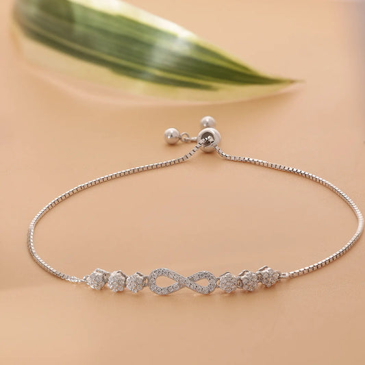 Devised to be balanced in terms of meaning and detail, this silver bracelet features a subtle infinity charm, which implies continuity and connection. The infinity charm is accented with brilliant cubic zirconia stones that reflect the light. CZ clusters in the form of flowers on both sides create the texture...