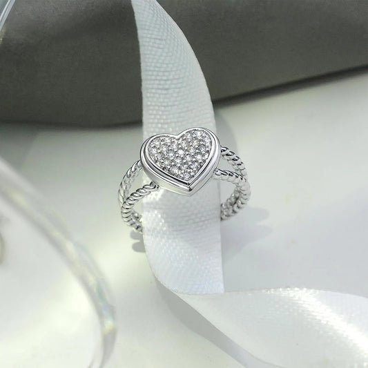 The Heart Ring is crafted from 925 sterling silver with a stunning shine finish thanks to a high-grade rhodium plating. It features a heart-shaped pattern in the center, which is embedded with small, round-cut cubic zirconia stones attached to a twisted rope two-band. The heart motif symbolizes love, affection, and...