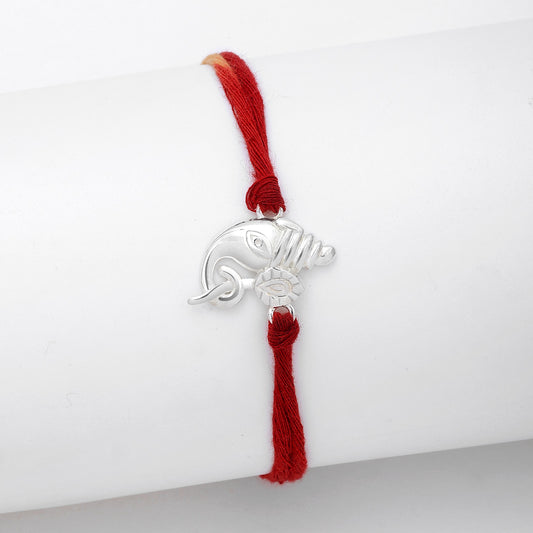 Designer Om Ganesha Silver Rakhi features a carved hollow CZ-studded Lord Ganesha idol with the togetherness of Om in a silver frame made of 925 sterling silver and plated with a sleek rhodium finish. The silver frame is knotted with twisted red and yellow thread for a perfectly relaxed fit....