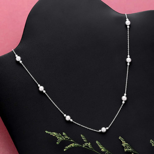 The Classic Silver Rope Chain with Beads has a simple design that is made of 925 sterling silver and plated with a high-grade rhodium finish. It features several pairs of one larger ball in the center and two small circular balls set around the rope link chain. Tweov handcrafted this...