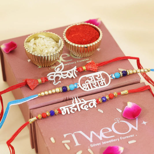 Krishna Mahadev Silver Rakhi for Brother (Pack of Three) has multiple holy designs with a glossy rhodium finish. It includes three carved rakhis featuring Shri Krishna, Jai Shree Ram, and Mahadev with trishul, connected with three different types of red, blue, and white threads adorned with golden, cream, blue, sky...
