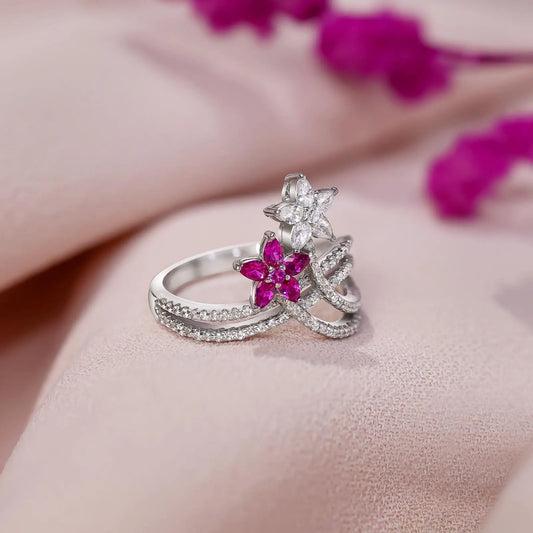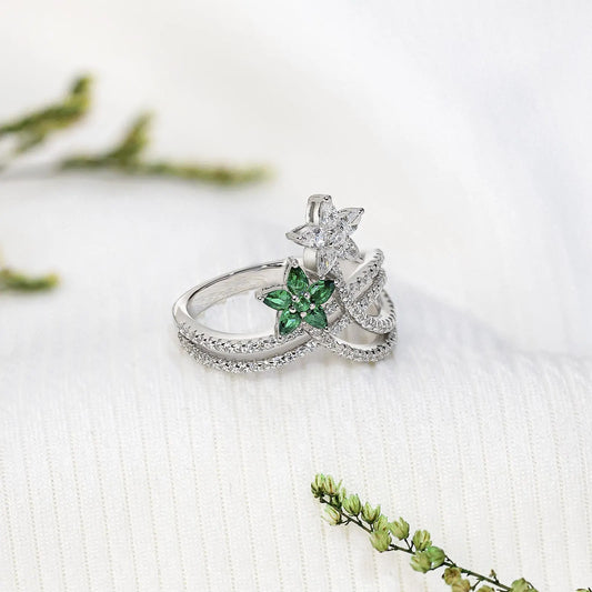Inspired by nature, this green and white floral ring is designed for the modern woman who loves playful elegance. Crafted in 925 sterling silver with rhodium plating, it features two sparkling flowers, one studded with clear CZ stones, and the other with emerald green petals, symbolizing growth and grace. The...