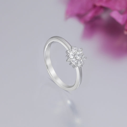 The 925 Sterling Silver CZ Blooming Flower Ring has an outstanding design, crafted with brilliance. The silver ring features a shiny American diamond in the center, encircled by several round cubic zirconia stones set in a flower pattern frame with stamens made of 925 sterling silver with a rhodium finish....