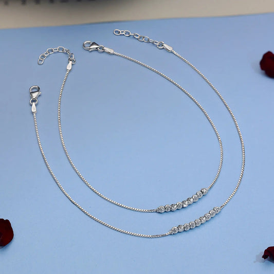 The Pure 925 Sterling Silver Trendy Silver Beads Chain Anklet has a modern design with a glossed rhodium finish. The silver leg bracelet features a plain snake chain decorated with six textured, silver-colored, sparkling round wheeler beads made of 925 sterling silver, which spin brilliantly. Tweov created this spinner silver...