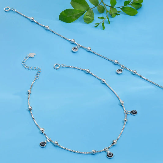 Pure 925 Sterling Silver Evil Eye Beaded Snake Chain Anklet has a beautiful design plated with a premium rhodium. The chain anklet features a snake chain decorated with several balls and three round-shaped evil eyes set in pure silver frames made of 925 sterling silver. Tweov created this evil eye...