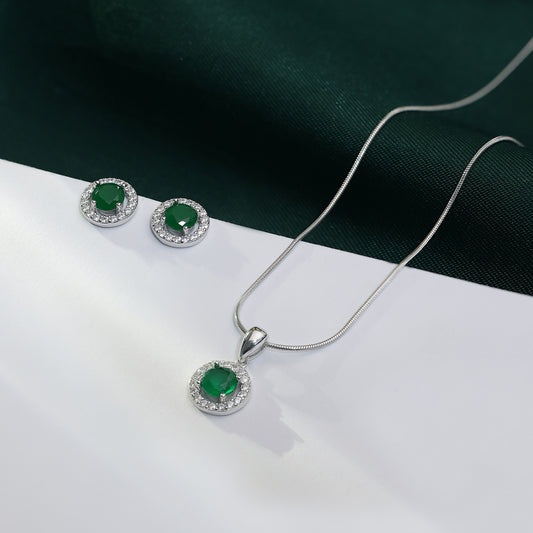 Round Cut Green Stone Silver Pendant & Earrings Set has a chic design with a high-grade rhodium finish. The silver set features a round-shaped silver pendant adorned with a larger central green-colored American diamond encircled by small white round cubic zirconia stones, a sleek snake-style chain, and a pair of...