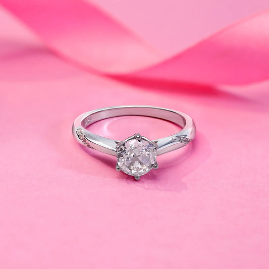 Celebrate love and elegance with this solitaire cubic zirconia ring, a masterpiece crafted from 925 sterling silver. The round-cut cubic zirconia, known for its diamond-like brilliance, is securely held in a six-prong setting, reflecting light beautifully. This rhodium-plated silver band adds more strength of classic to your jewellery collection forever. An...