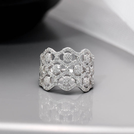 The 925 Sterling Silver Cubic Zirconia Queen Crown Ring has an eye-catching design, crafted from pure 925 sterling silver and coated with premium rhodium to give it a shiny texture. This ring design symbolises love, royalty, and empowerment. The ring features a wide, complex design of circles connecting each other...