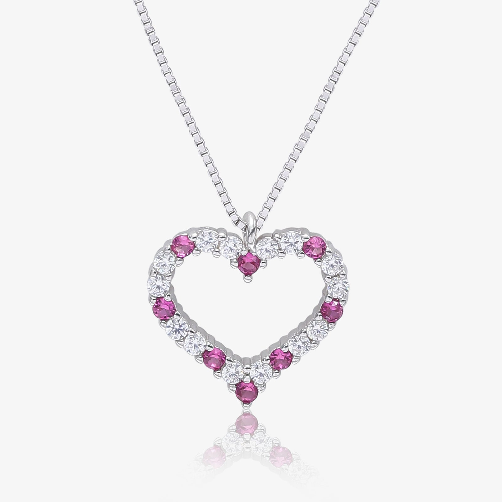925 Sterling Silver Pink Heart Pendant with Chain for Women made of pure 925 sterling silver with a versatile design. The jewellery set features a box chain and a glossed rhodium-plated heart-shaped silver pendant adorned with several shiny, white cubic zirconia stones and eight dark pink ruby stones set in a pure silver frame. Tweov designed this heart pendant lovingly to give a luxurious design to women's collections and a smooth look to their necklines. Adding this love necklace will make you feel charming. Being dressed with it on a special day, this necklace will bring dreamy love. This heart-shaped silver pendant with a chain is a remarkable gift for your lover to feel lovable and create a lovely moment to remember as a lifetime event.