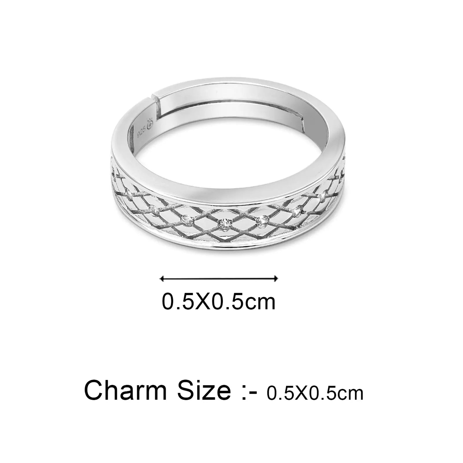 Made to suit women who want a balanced, detailed, yet not overly flashy silver ring. The ring band is crafted in pure 925 sterling silver and has a lattice-style criss-cross design across the centre. This formation with a structured surface is modern and composed in touch. The ring pattern is arranged with small, clear cubic zirconia stones set in intervals.