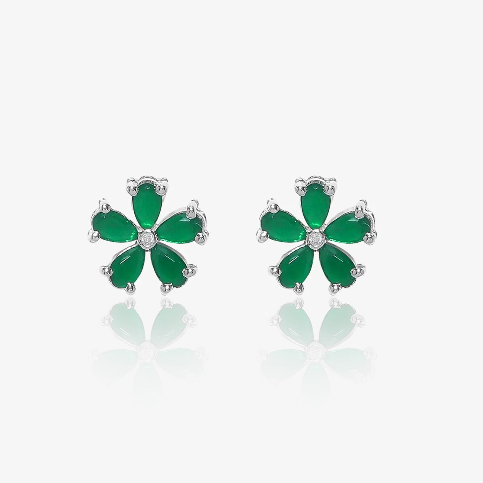 These flower-shaped pure silver earrings have five stunning emerald stones in the middle to represent petals and impart a glamorous look. These earrings are detailed with engravings and feature precious emeralds, making them a perfect accessory to appreciate luxurious accessorizing.
