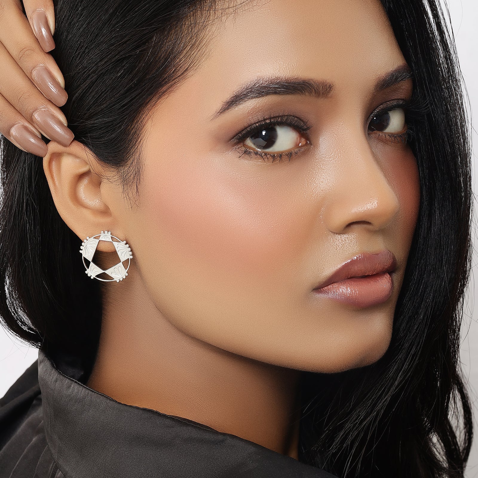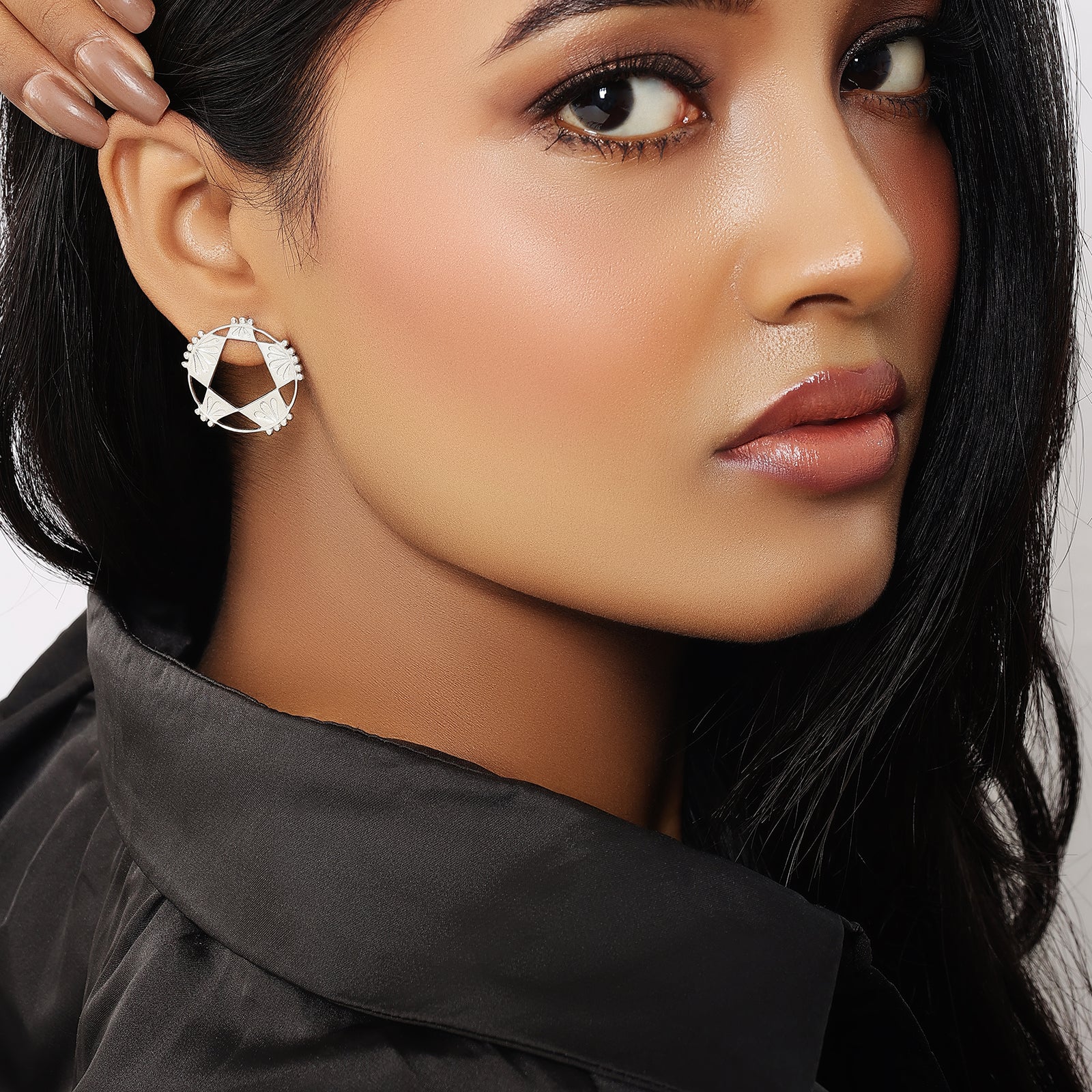 925 Sterling Silver Circular Star Stud Earrings have a lovely design with a superior rhodium finish. The silver studs feature an interior of the circle divided into five sections connecting to the circular frame, forming a perfect textured star shape pattern within the circle made of 925 sterling silver, making it shine. Tweov created this geometric star-shaped earring to demonstrate historical jewellery patterns with a modern touch in a pure silver frame. Adding these star stud earrings to your designer ethnic jewellery collection will bring you unconditional charm and adorn your earlobes. These silver earrings are more than a perfect gift for your loved one; they can also be amazingly comfortable to wear to make endless memories.