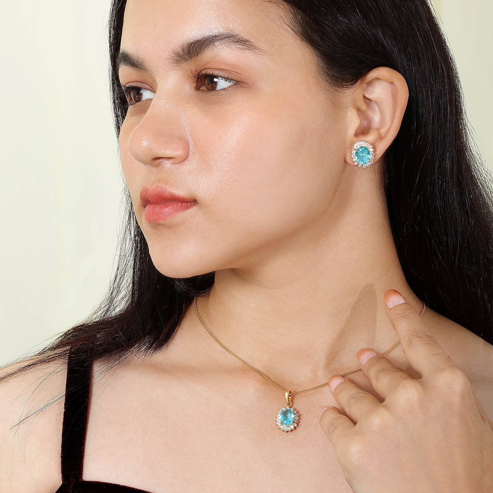 The Gold Plated Silver Sky Blue Stone Studded Pendant & Earrings Set has a classy gold plating finish. It is made from pure 925 sterling silver with a gold finish. Sky-blue zirconia is a symbol of inner peace and self-possession. The pendant and earrings have a floral look because of the oval sky-blue zircon in the center and the shiny white cubic zircons that surround it. This design of Tweov is very thoughtful for women who want to bring peace and arouse calmness in life. This light-blue-colored jewelry set is a remarkable choice for special occasions or for gifting someone who loves to connect with the sky.