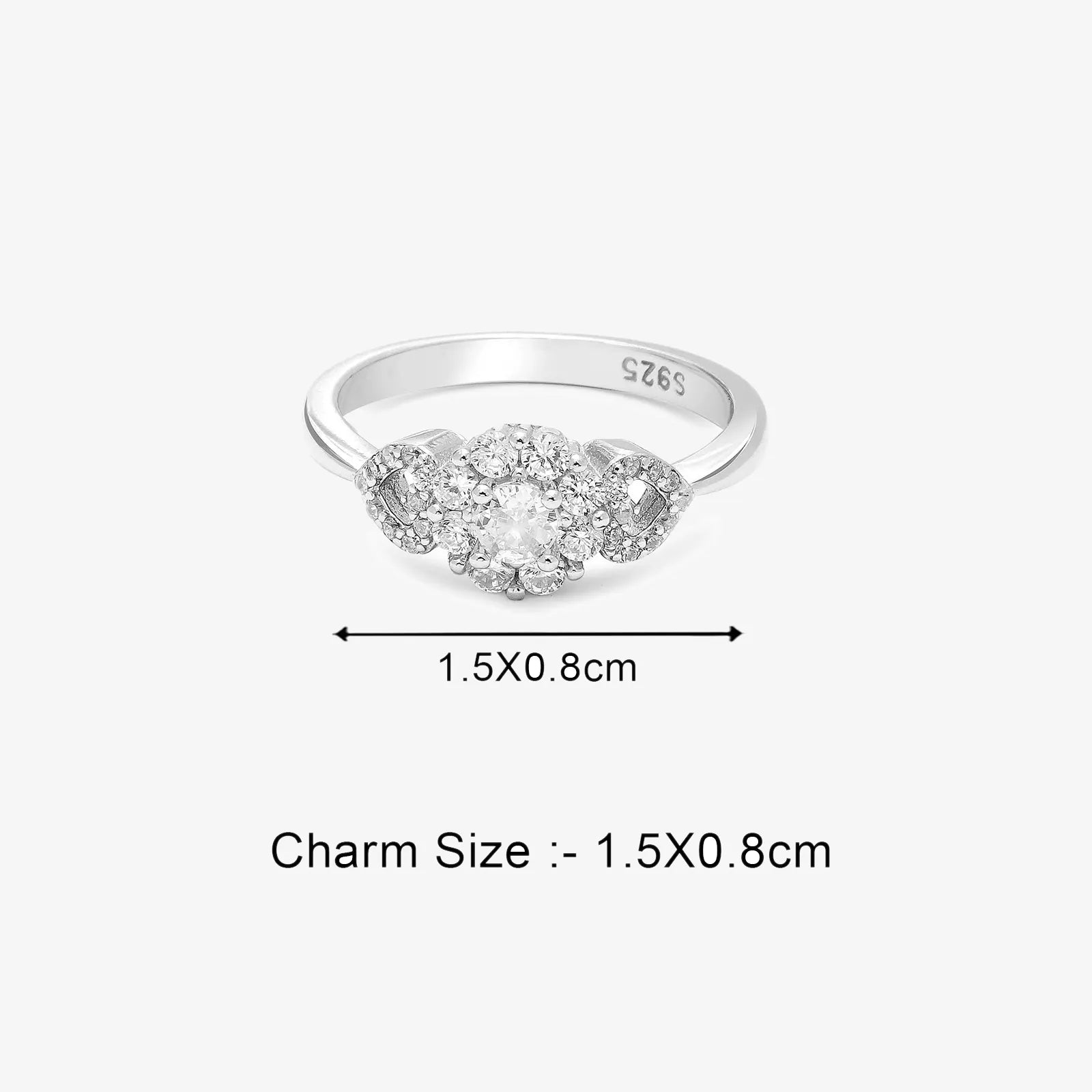 This silver ring features a shimmering triple-cluster top in which the central CZ floral design is balanced with two CZ-accented hearts on either side. The ring is made of pure 925 sterling and feels light on the hand. The zirconia stones are tightly packed to give the rich, stratified appearance from the top view. This silver ring is best worn on occasions rather than when worn daily.