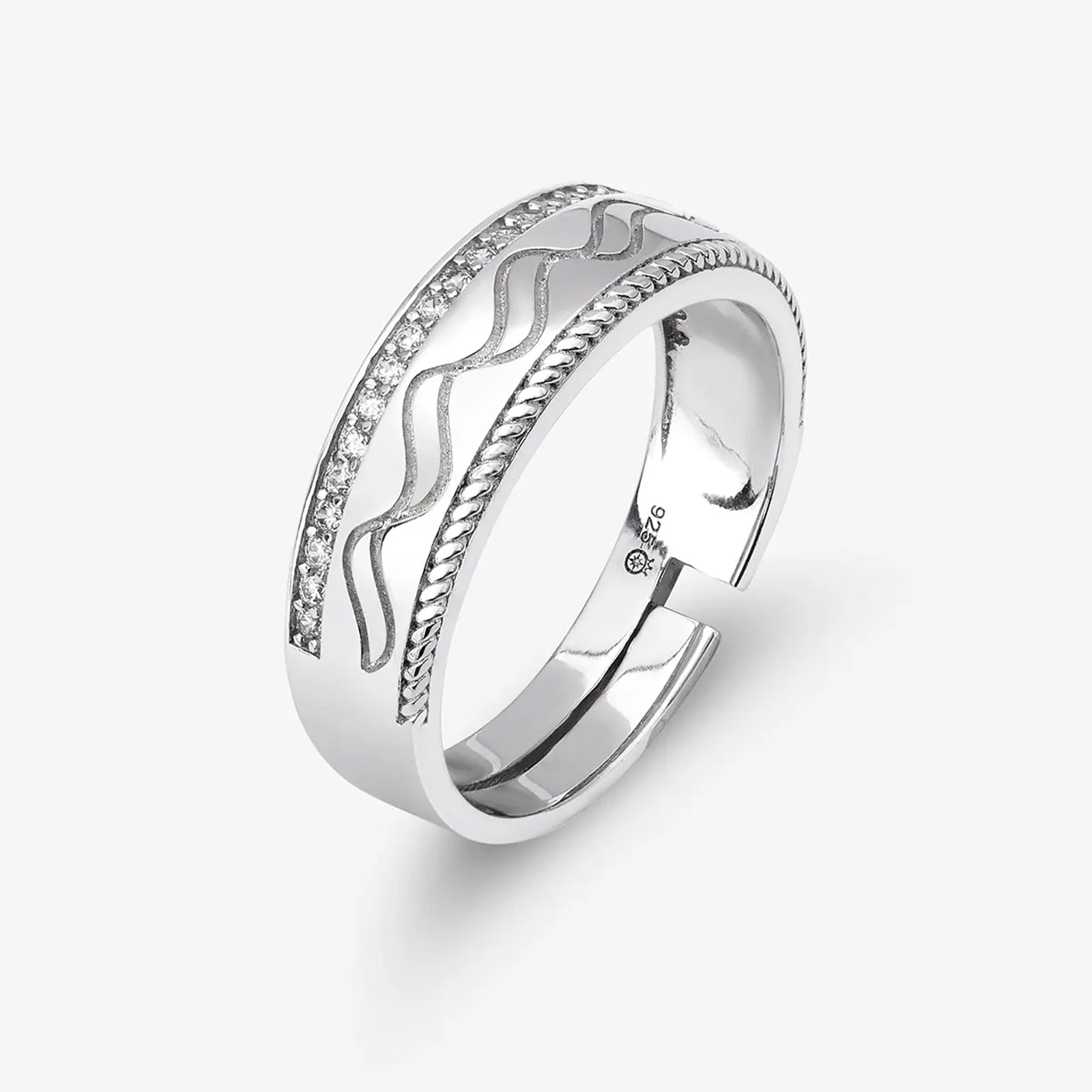 This silver ring has crisp lines with a bit of personality. It is crafted of premium 925 sterling silver with a beautiful wave cut-out design at the centre, surrounded by a line of transparent cubic zirconia stones. The shank is well-designed, slightly broad, and well-tuned to fit tightly and yet comfortably for long-term wear.