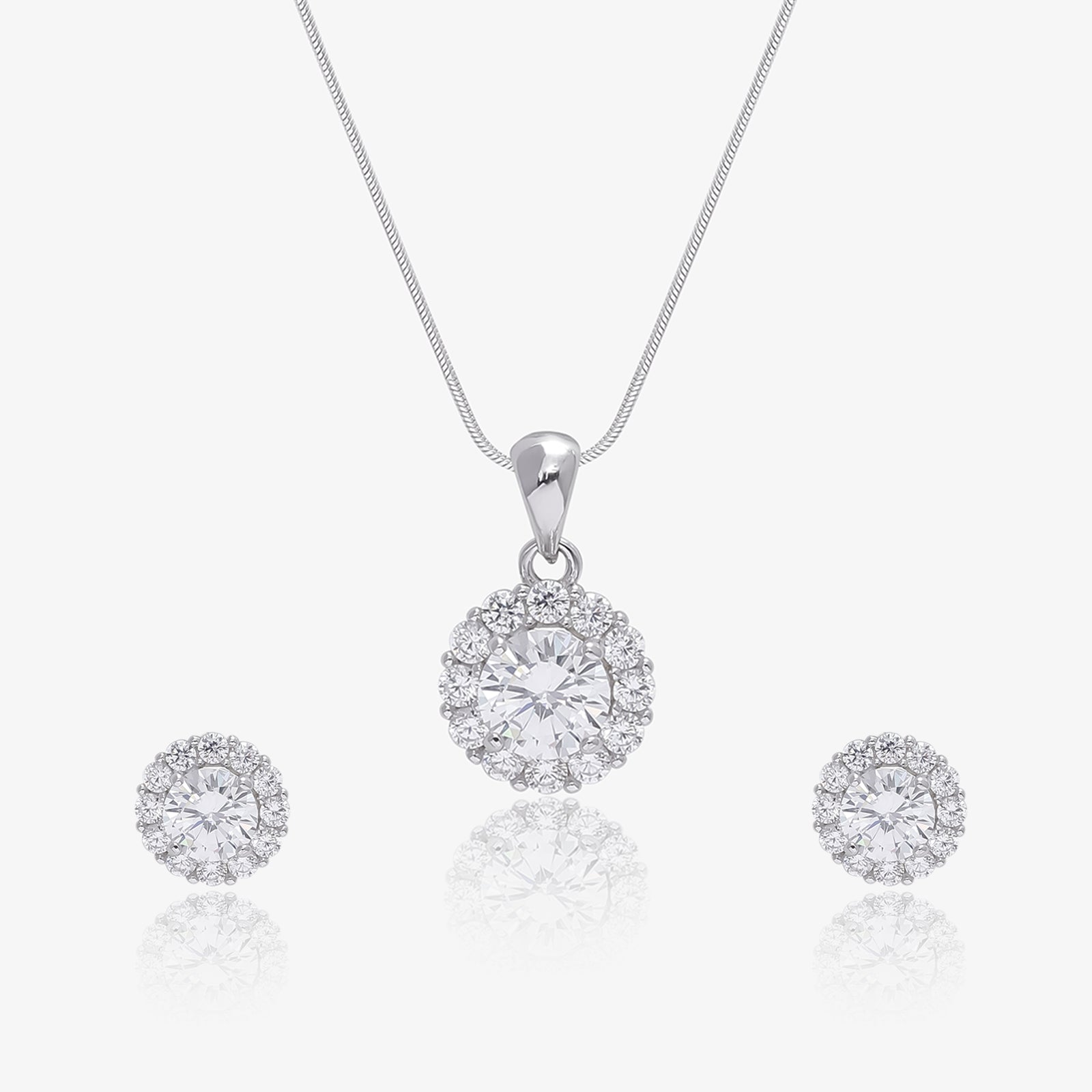 Round Floral Design Silver Pendant & Earrings Set has a bold design with a high-grade rhodium finish. The silver set features a round-shaped floral silver pendant adorned with a larger central American diamond encircled by small round cubic zirconia stones, a sleek snake-style chain, and a pair of round floral-style stud earrings made of premium 925 sterling silver. Tweov crafted this set for women so they can enjoy blossoms around their neck in style. This set is a suitable choice for women to wear on festivals like Diwali, Holi, Karwa Chauth, Eid, and Onam. Moreover, dress it with a sari or kurta for an ethnic look, or jeans and a t-shirt, a long skirt, a top, a gown, or a midi for a modern style. It will be a perfect gift to memorialize moments and add to your trendy wardrobe.