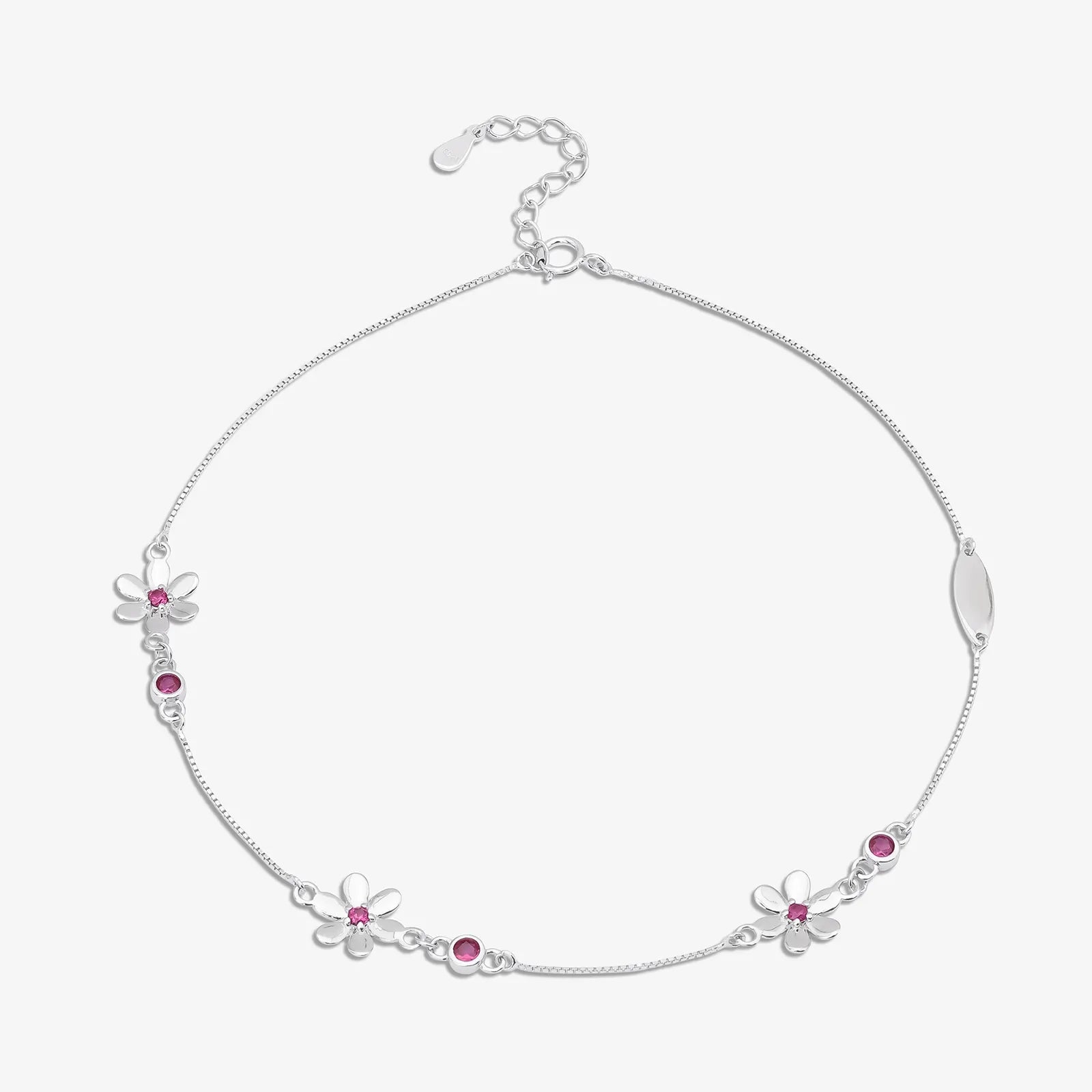 Add a light touch to your daily fashion with this pair of silver anklets. The anklets are adorned with floral charms at equal spacing, creating a refined appearance over the ankle. Each floral motif is topped with a pink cubic zirconia stone, a gentle touch of vibrance for the entire design. The anklets are made of 925 sterling silver and plated with rhodium, and they keep up their shine and gloss with time.