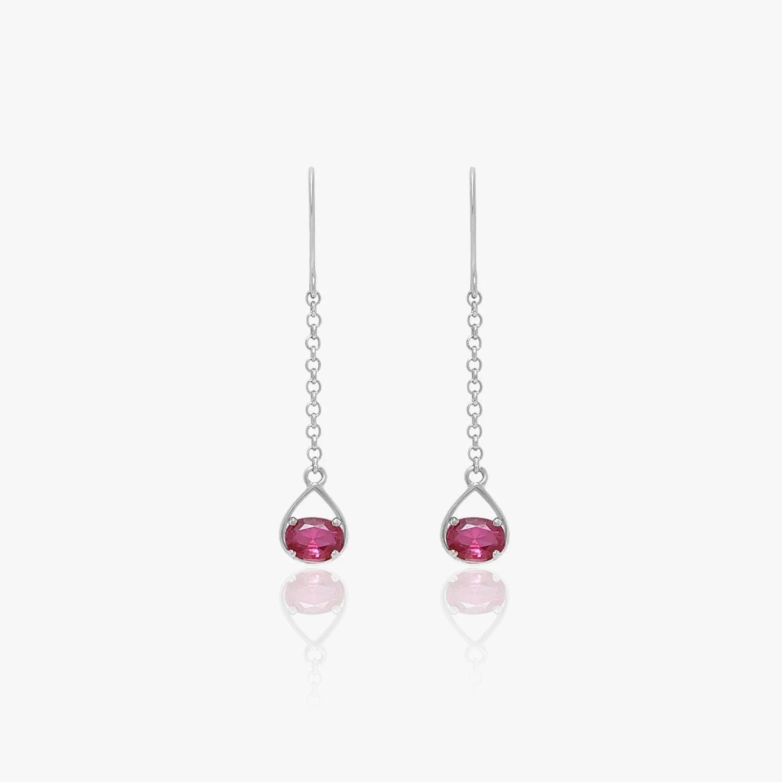 Pure 925 Sterling Silver Pink Stone Long Chain Drop Earrings made of 925 sterling silver. These long chain earrings feature an elongated oval-shaped pink ruby stone in the centre of the drop-shaped frame, connected with the thin rope-style chain polished with a fine-quality rhodium finish. These long-drop earrings by Tweov are for women who like delicate, featherlight chain earrings with a burst of pink shine. These pink stone earrings are the most suitable choice to gift your loved one to make them feel special and symbolise femininity and love. It can be the perfect gift for yourself to wear with every outfit.